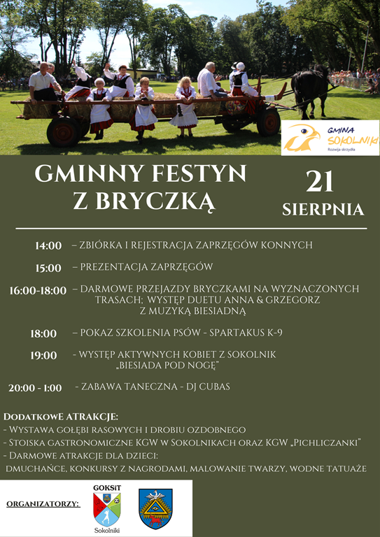 GOKSiR i Urząd Gminy Sokolnika zapraszają na Gminny Festyn z Bryczką, który odbędzie się w sobotę, 21 sierpnia.