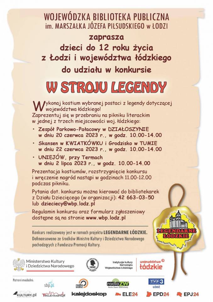 Zadaniem uczestnika konkursu jest przygotowanie przebrania postaci z legendy związanej z województwem łódzkim i zaprezentowanie jej wraz z krótkim opisem na pikniku literackim w jednym z trzech miejscowości woj. łódzkiego: