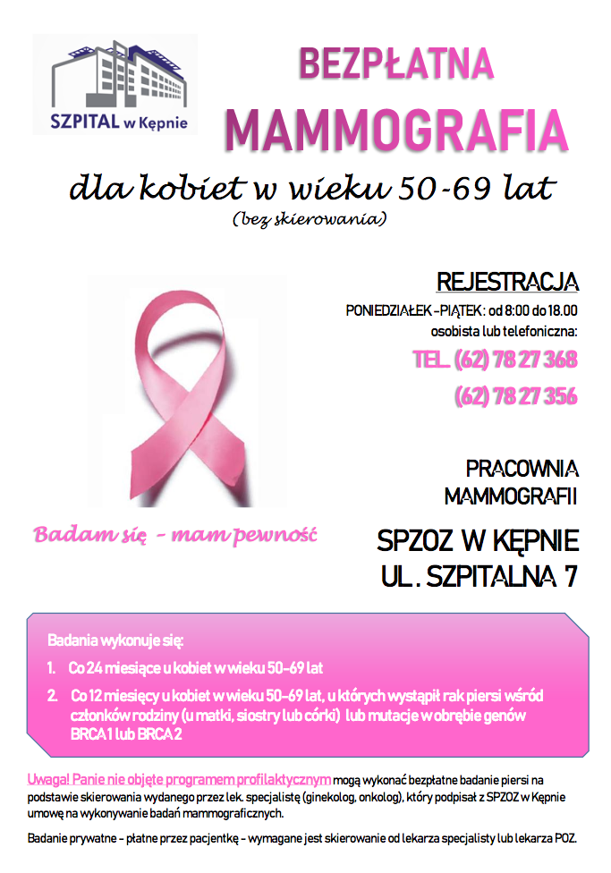 Samodzielny Publiczny Zakład Opieki Zdrowotnej w Kępnie zaprasza na bezpłatne badania mammograficzne panie w wieku od 50 do 69 lat.
