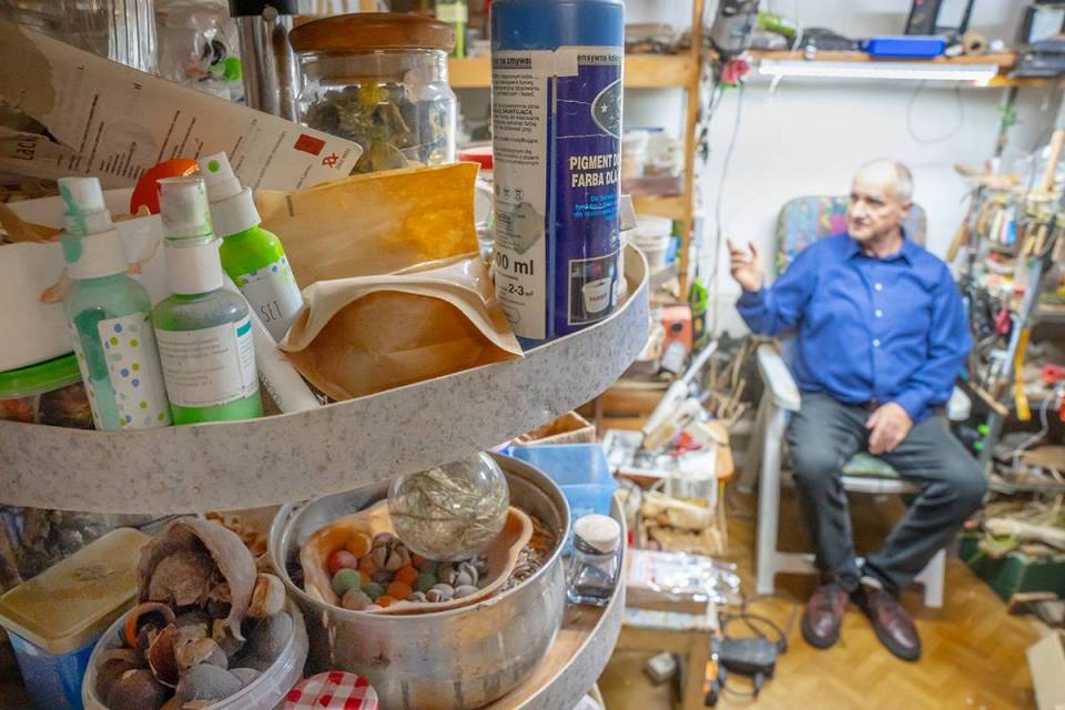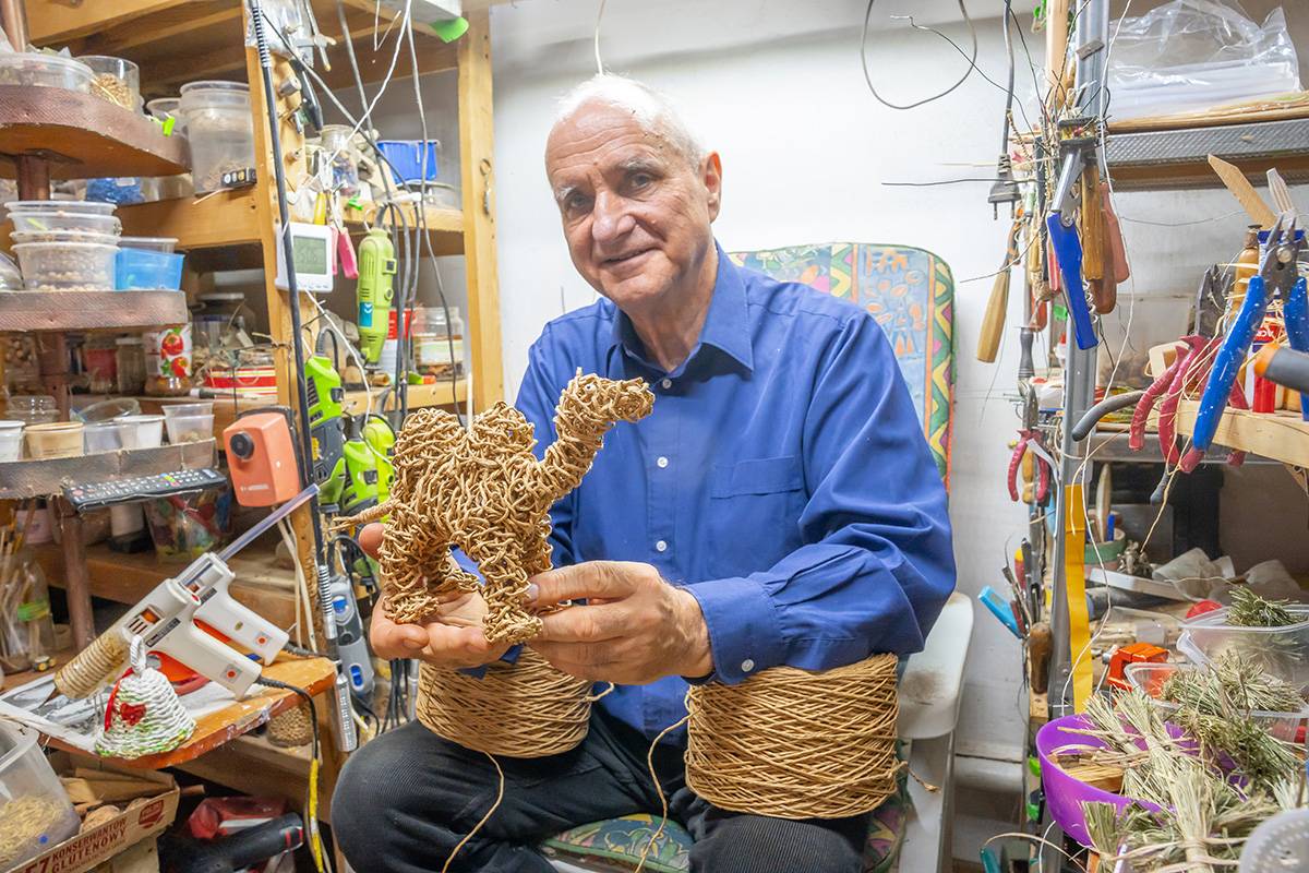 Na jego stoisku oprócz mikroskopijnych szopek i orzechowych dekoracji oraz zabawek, można znaleźć plecionki. Już nie kompozycje z suchymi kwiatami, ale wszystko, co podpowie wyobraźnia. Ze sznurka papierowego tworzy sztukę użytkową – plecaki, torby oraz kapelusze z najsłynniejszym, czyli kapeluszem Pilickim, regionalnym produktem z certyfikatem marki Dolina Pilicy Zwolnij Bieg. Ale są i cylindry, jest kapelusz czarodzieja, pleciony hełm strażacki czy czapka czołgisty.