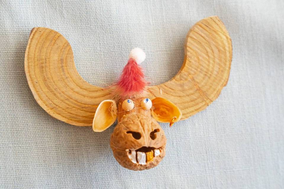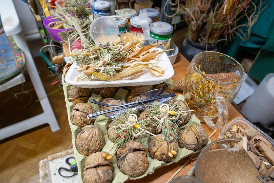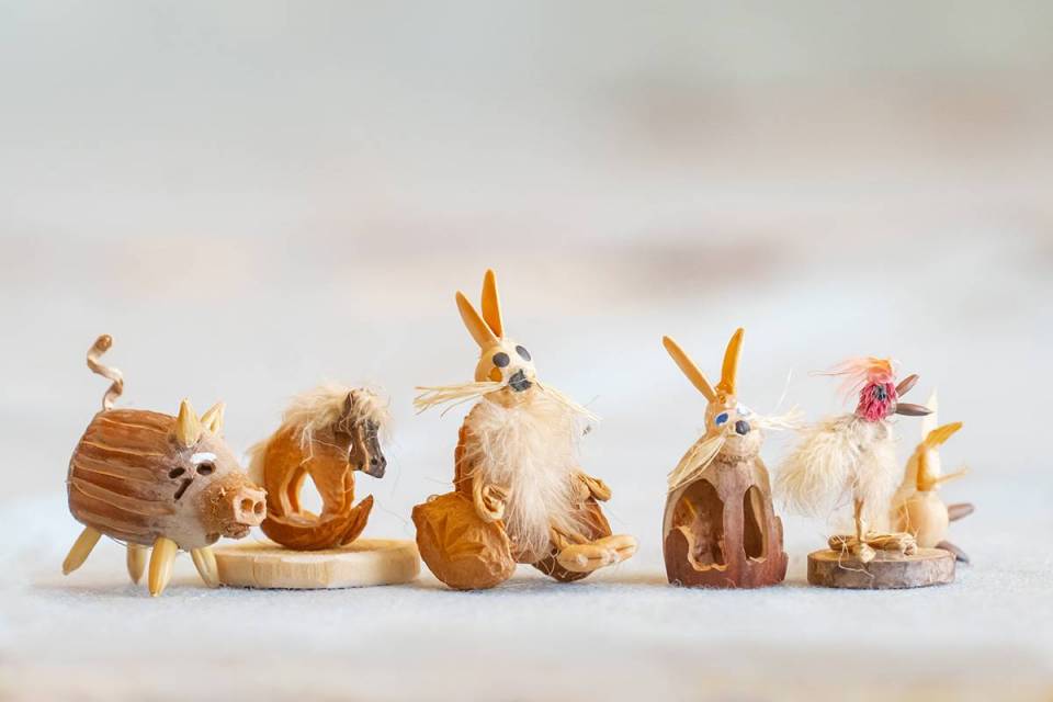 Bazą do wykonania tych niezwykłych, mikroskopijnych ozdób są tylko naturalne materiały: łupiny orzechów, żołędzie, główki makówek, kawałki drewna, traw, kora, mech, ziarnka zbóż. Jak mówi sam artysta, wykorzystuje to, co innym może wydawać się bezwartościowe. Jego pracownia to prawdziwy magazyn m.in. łupinek po orzechach włoskich, które ma w swoim ogrodzie, ale i które przynoszą mu ludzie. Pan Mariusz potrafi z nich wyczarować praktycznie wszystko – orzech może być dzikiem, pszczółką Mają, konikiem na biegunach, brzuchem Mikołaja, kulami bałwanka czy wózkiem dla malutkiej małpki. Każda ozdoba zachwyca precyzją wykonania i niewiarygodną fantazją autora. Figurki grają na instrumentach, wspinają się po linach, jeżdżą na wózeczkach.