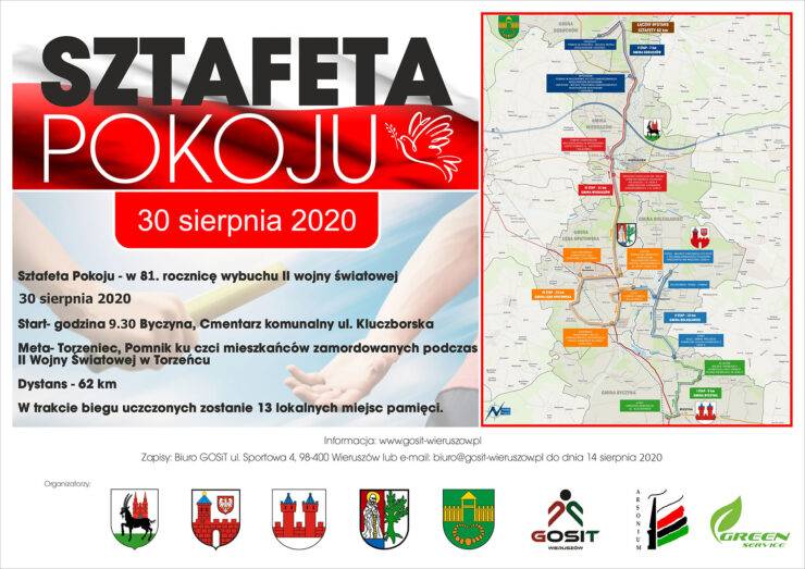 GOSiT w Wieruszowie zaprasza do uczestnictwa w „Sztafecie Pokoju", organizowanej przez Gminę Wieruszów, Gminę Bolesławiec, Gminę Byczyna, Gminę Łęka Opatowska, Gminę Doruchów, Towarzystwo Historyczno- Kulturalne Arsonium, Gminny Ośrodek Sportu i Turystyki w Wieruszowie oraz Spółdzielnię Socjalną Green Service.
