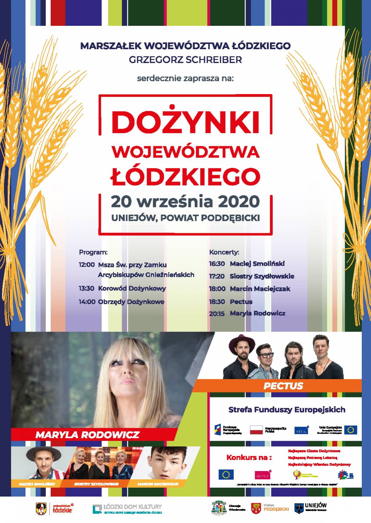W tym roku Dożynki Województwa Łódzkiego rozpoczną się mszą świętą o godz. 12.00 na terenie Zamku Arcybiskupów Gnieźnieńskich. Po mszy korowód dożynkowy przejdzie na teren rekreacyjny przy termach. Natomiast od godz.16.30 rozpocznie się część koncertowa. Na scenie wystąpią: Maciej Smoliński, Siostry Szydłowskie, Marcin Maciejczak, Pectus i Maryla Rodowicz.