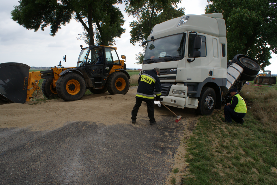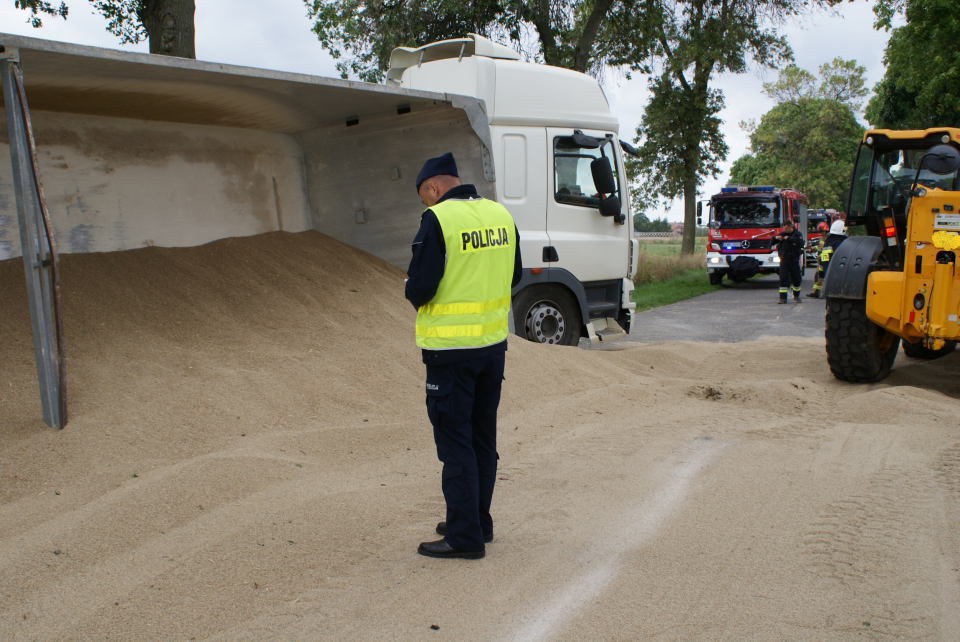 Wywrócona naczepa samochodu ciężarowego z której wysypało się zboże we wtorkowe przedpołudnie była przyczyną zablokowania drogi relacji Dzietrzkowice – Wieluń.